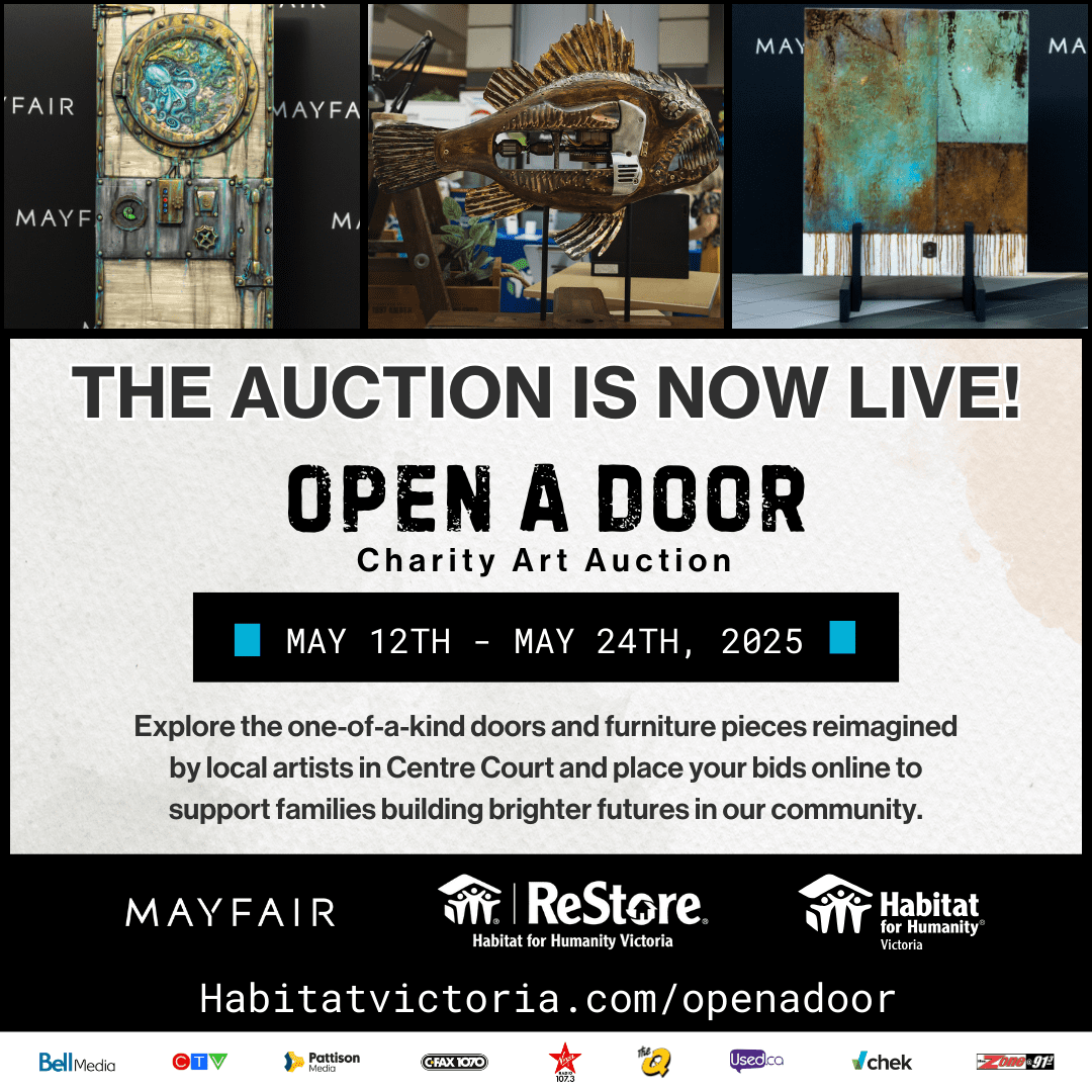 Join us at Mayfair Shopping Centre for a special event in support of Habitat for Humanity Victoria. From May 12 to May 24, visit our Centre Court to explore a one-of-a-kind Art Showcase featuring stunning works by local artists—each created on reclaimed doors or other small pieces of furniture from Habitat Victoria or Westshore ReStores.