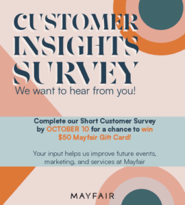 Your input will help us share updates and content on the platforms you use most. Take a moment to complete our Customer Insights Survey and you’ll be entered for a chance to win a $50 Mayfair Gift Card.Your feedback helps us make Mayfair even better for you and our community.