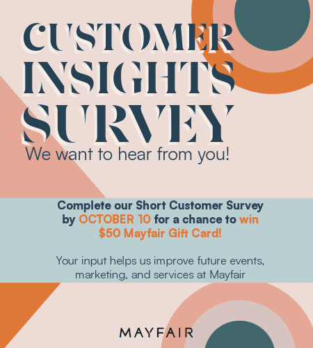 Mayfair Shopping Centre is not responsible for late, lost, incomplete, misdirected, or delayed entries, or for technical failures of any kind. Entrants release Mayfair Shopping Centre from any and all liability related to this Giveaway or acceptance and use of any prize.