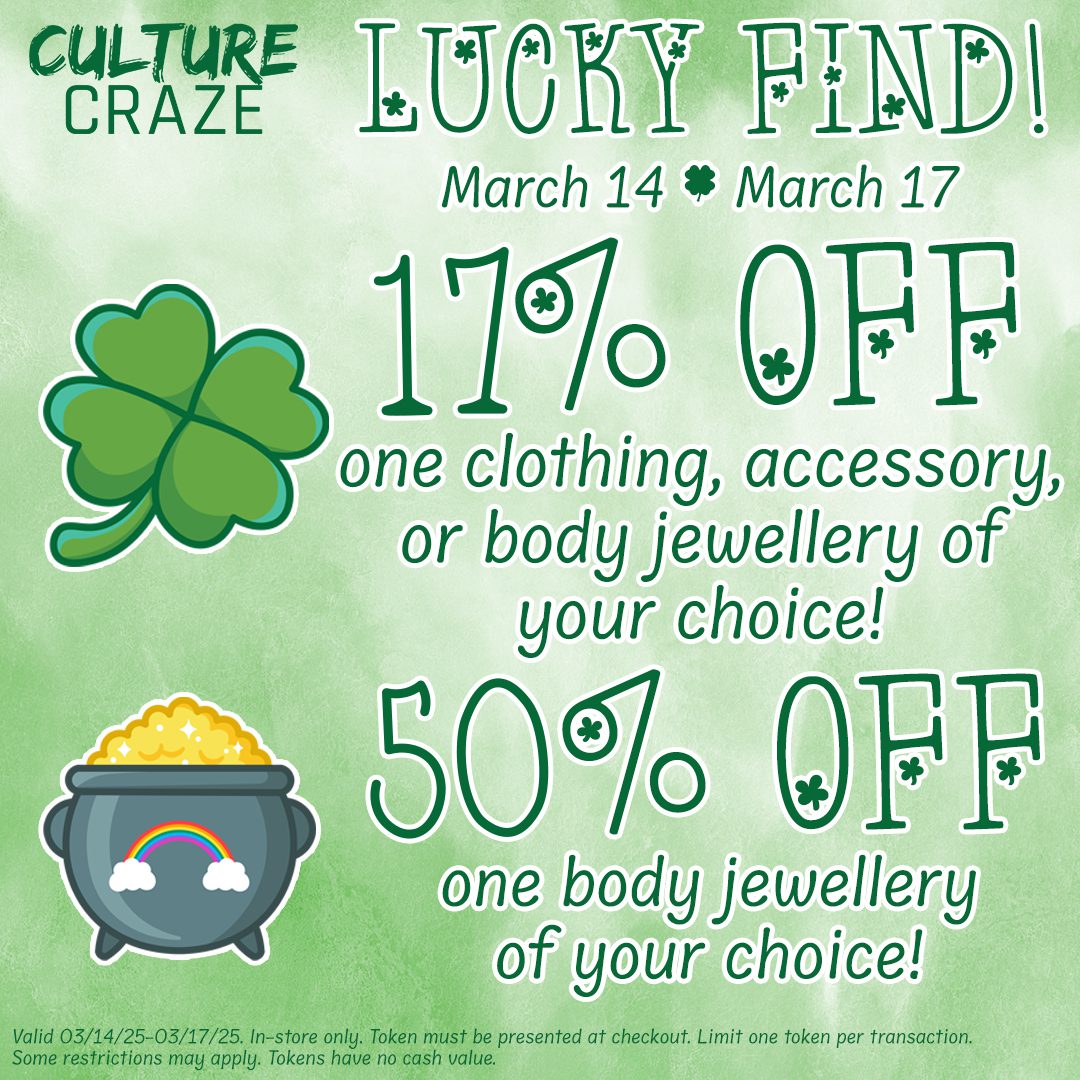 Join us for a Lucky Find Scavenger Hunt this St. Patrick’s Day weekend! Hidden throughout our store are Four-Leaf Clovers, waiting to be discovered and redeemed for 17% OFF one clothing, accessory, or body jewellery of your choice! But if luck is truly on your side, you might stumble upon the coveted Pot of Gold, unlocking 50% OFF one body jewellery of your choice!