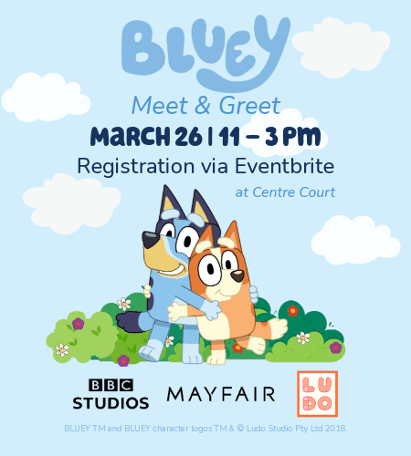 Disclaimer: By reserving a free ticket for the Bluey & Bingo Meet & Greet, you are subscribing to our mailing list. You will receive event updates and exclusive offers from Mayfair Shopping Centre. You can unsubscribe at any time. Please note that photography and video will be taken during the event and may be used for Mayfair Shopping Centre’s marketing and promotional purposes.