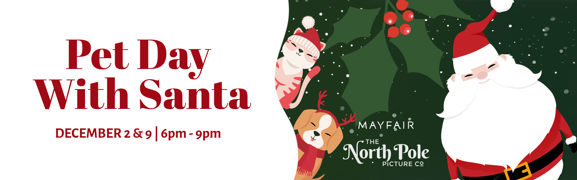 Celebrate the holidays at Mayfair with a memorable photo of Santa and your furry friend at our Mini North Pole!