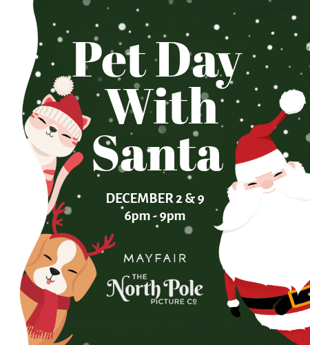 Celebrate the holidays at Mayfair with a memorable photo of Santa and your furry friend at our Mini North Pole!